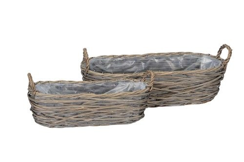 Grande: 46x17x13Hcm + 6cm asa Pequeño: 35.5x12.5x11Hcm + 6cm asa Set de dos cestas de mimbre con asa e interior de plástico transparente.