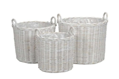 Grande:Ø53x54Hcm Mediano: Ø41x49Hcm Pequeño: Ø36x41Hcm Este set de tres cestas de mimbre con asas es perfecto para añadir un toque natural a su hogar. Cada cesta cuenta con un interior de plástico, asegurando que la humedad no dañe el material exterior.
