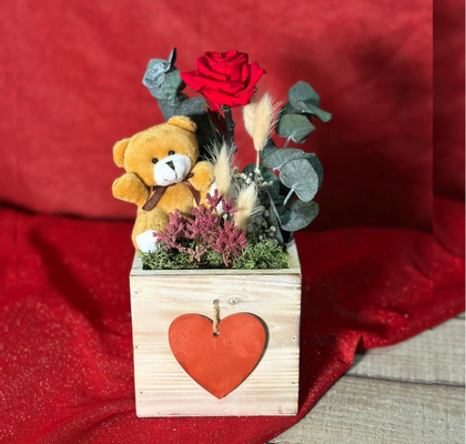 Cajita con flores preservadas y rosa preservada, con un pick de peluche, ideal para regalar.