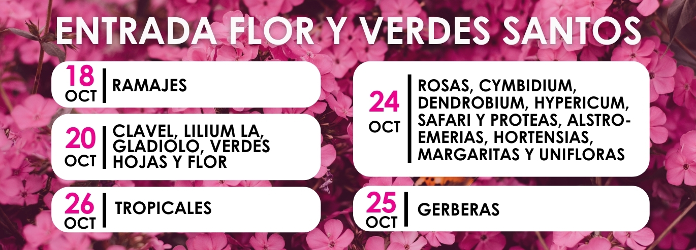 - 24 de Octubre: Cymbidiums, Dendrobium, Hypericum, Rosas, Safaris, Proteas, Alstroemerias, Hortensias, Margaritas, Uniflor.