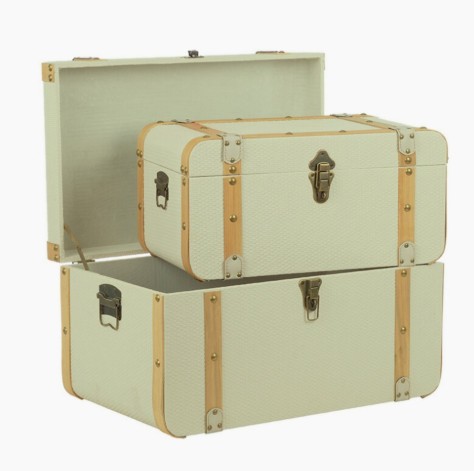 Estas maletas decorativas, en tono verde salvia, presentan un diseño elegante y funcional. Con asas de cuero que añaden un toque de sofisticación, son ideales para complementar la decoración de cualquier espacio, aportando un aire vintage y acogedor. Su versatilidad permite utilizarlas tanto como elementos decorativos como para almacenamiento, convirtiéndolas en una opción práctica y estilizada.