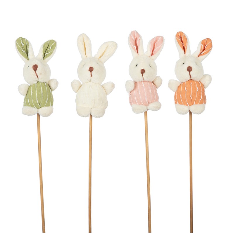 Este pick de conejitos de peluche, surtido en cuatro colores (verde, blanco, rosa y naranja), son perfectos para añadir un toque lúdico a cualquier arreglo floral o planta.