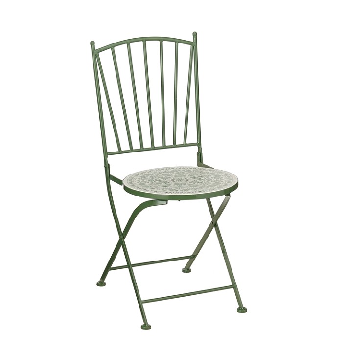 Silla plegable. Esta silla combinan un diseño moderno con funcionalidad, gracias a su color verde y a la decoración en el asiento que aporta un toque distintivo a cualquier espacio.
